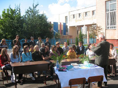 Зустрічі в імпровізованому кафе «Муза» не посмів перешкодити навіть дощ. Старшокласники, вчителі, директор школи, його заступники – усі були вдячними слухачами і глядачами. Євген Шморгун, відомий письменник, автор більше двадцяти художніх книг, директор видавництва «Азалія», заступник голови обласного товариства «Просвіта» натхненно розповідав про людей, які прославили Рівненщину і місто Рівне.